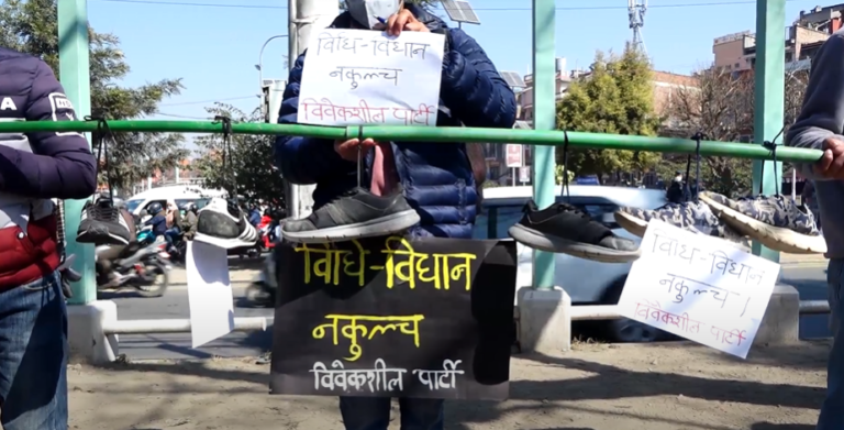 काठमाडौँ– प्रधानमन्त्रीले संविधान कुल्चिएर संसद विघटन गरेको भन्दै विवेकशील पार्टीले काठमाडौंमा जुत्ता प्रदर्शन गरेको छ