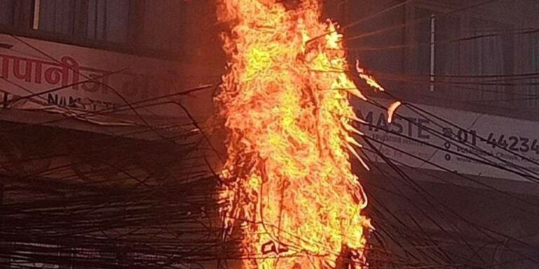 काठमाडौँ- काठमाडौँको पुतलीसडकमा विजुलीको ट्रान्समिटर पड्किँएर आगलागी भएको छ। आइतबार बिहान पुतलीसडकको कम्प्युटरबजार अगाडी रहेको