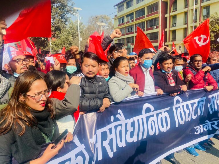 काठमाडौँ– नेपाल कम्युनिस्ट पार्टी (नेकपा)को दाहाल-नेपाल समूहले प्रतिनिधिसभा विघटनविरूद्ध काठमाडौँका १३ ठाउँबाट जुलुस निकालेको छ।
