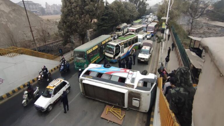 काठमाडौँ– काठमाडौँको रत्नपार्क भद्रकाली सडक खण्डमा यात्रुबाहक बस बीच बाटोमै पल्टिएको छ । तीब्र गतिको
