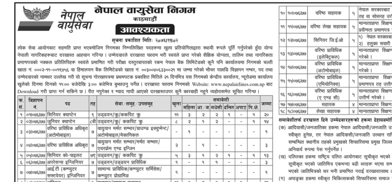 काठमाडौं– नेपाल वायु सेवा निगमले ठूलो संख्यामा कर्मचारी माग गरेको छ । शुक्रबार सूचना प्रकाशित