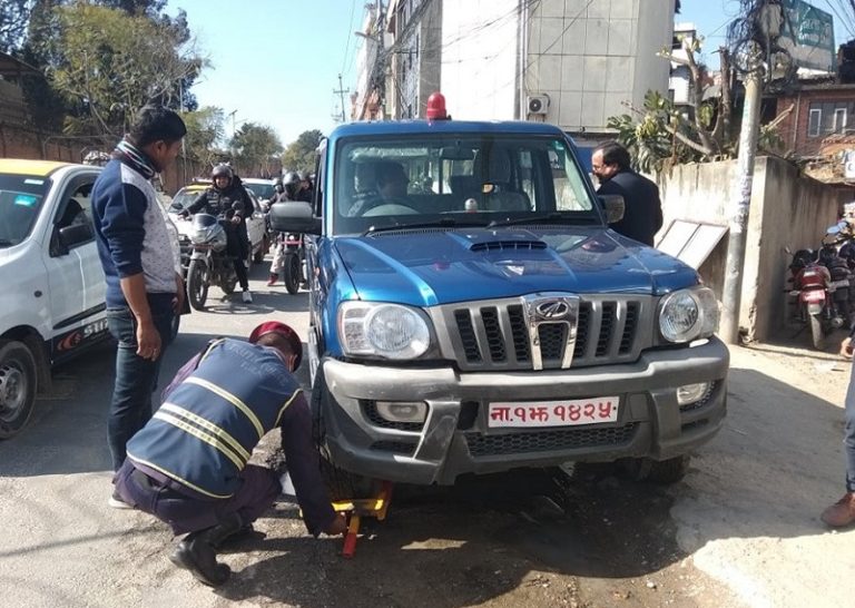 काठमाडौं– ट्राफिक प्रहरीले साइरन जडित प्रहरी गाडीमा ‘ह्विल लक’ गरिदिएको छ । अनामनगरमा सडक अवरुद्ध