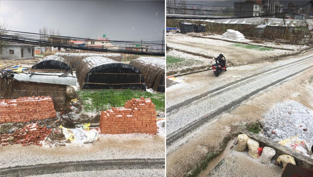 काठमाडौं– शनिबार दिउँसो भक्तपुरमा भीषण असिना पानी पर्यो । असिना पानीले खेतबारीमा लगाइएको तरकारी बाली