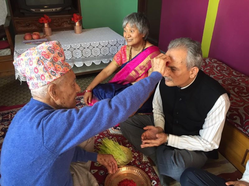 काठमाडौं- पूर्वप्रधानमन्त्री डा.बाबुराम भट्टराईले ९० वर्षीय बुबा भोजप्रसाद भट्टराईको हातबाट टीका लगाएका छन् । भट्टराईले