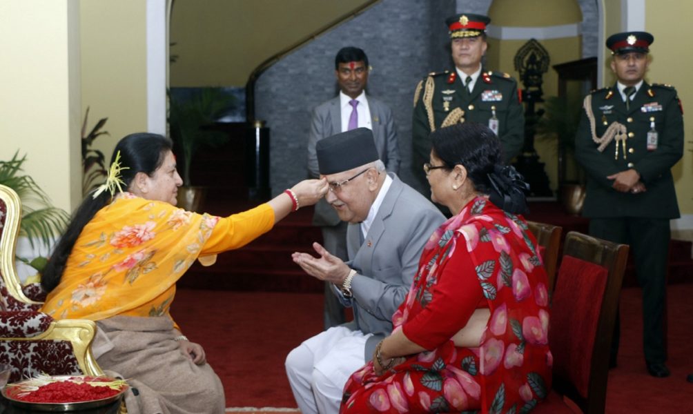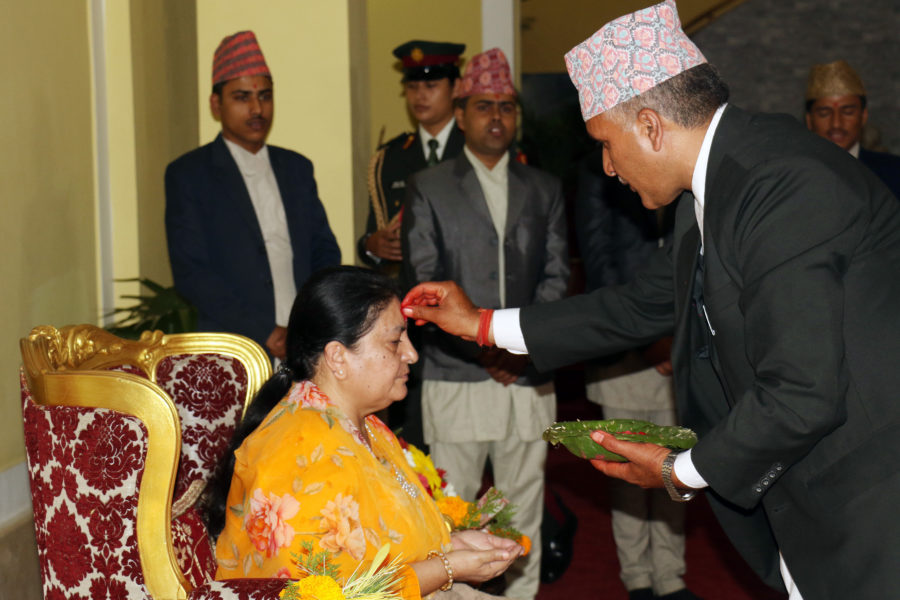 काठमाडौं-राष्ट्रपति विद्यादेवी भण्डारीले बडा दशैँका अवसरमा शीतल निवासमा प्रधानमन्त्री केपी शर्मा ओलीलगायत विशिष्ट व्यक्तिहरुलाई टीका