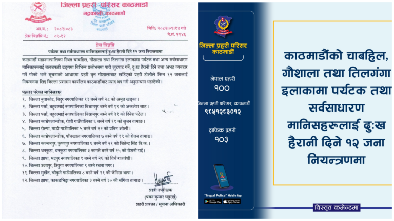 काठमाडौं – प्रहरीले पर्यटक तथा सर्वसाधारणलाई दुःख हैरानी दिने १२ जनालाई पक्राउ गरेको छ ।
