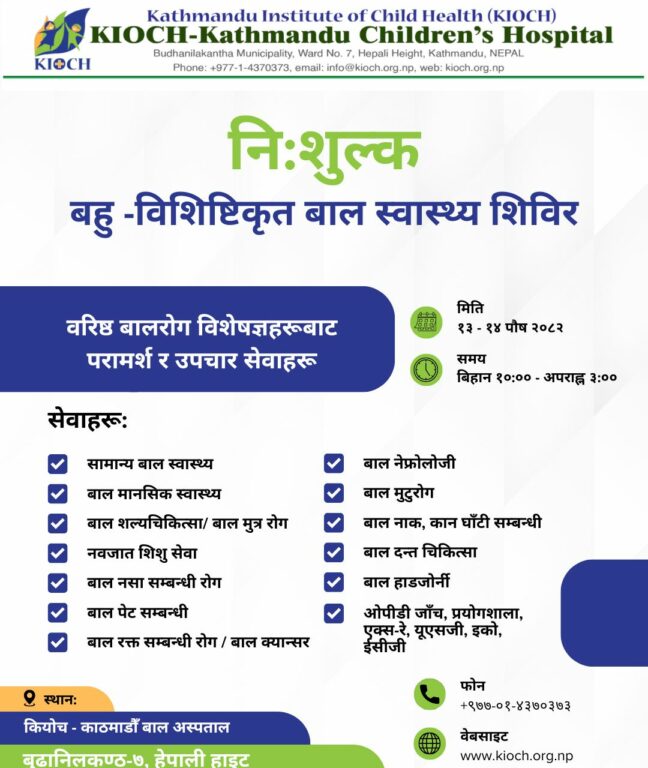 काठमाडौं– काठमाडौं इन्स्टिच्युट अफ चाइल्ड हेल्थ (कियोच) काठमाडौं चिल्ड्रेनस् हस्पिटलले निःशुल्क बहु–विशिष्ट बाल स्वास्थ्य शिविर