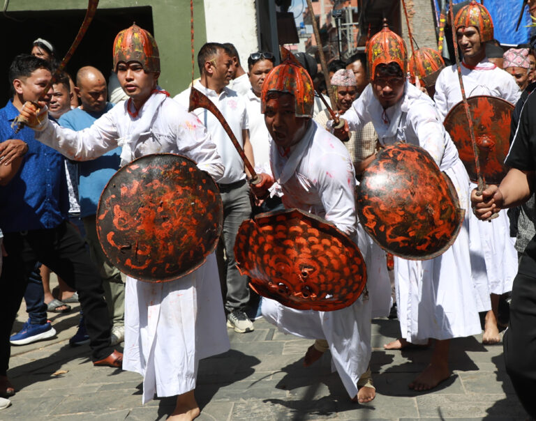 भक्तपुर– विजयादशमीका अवसरमा आज भक्तपुरमा परम्परागत हतियार प्रदर्शन गर्दै ‘पाँय् न्ह्याकेगु’ जात्रा सम्पन्न भएको छ