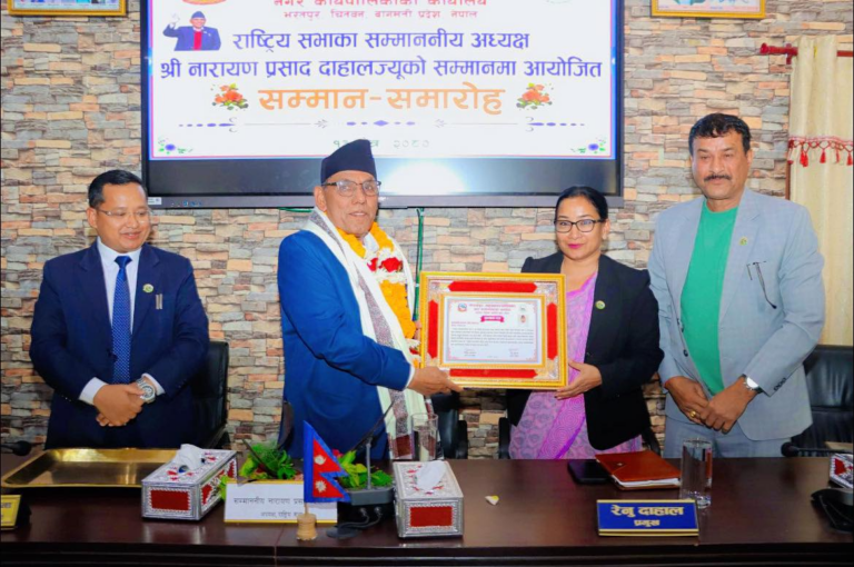 काठमाडौं– राष्ट्रिय सभाका नवनिर्वाचित अध्यक्ष नारायणप्रसाद दाहाललाई भरतपुर महानगरपालिकामा स्वागत तथा सम्मान गरिएको छ ।