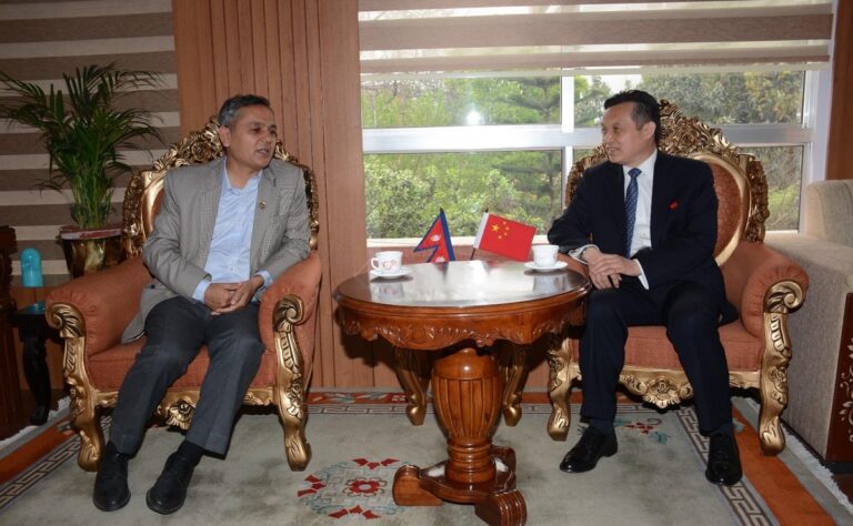 काठमाडौं– गृहमन्त्री ओमप्रकाश अर्यालसँग नेपालका लागि चिनियाँ राजदूत चाङ माओमिङले उनको कार्यकक्षमा शिष्टाचार भेट गरेका