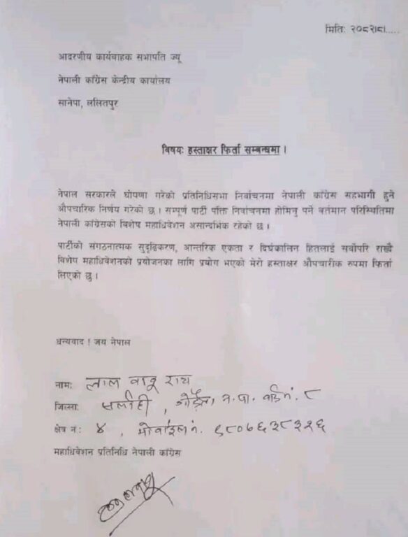 काठमाडौं– नेपाली कांग्रेसको विशेष महाधिवेशनको पक्षमा गरेको हस्ताक्षर फिर्ता गरेको भन्दै सर्लाही जिल्लामा नक्कली कागजात