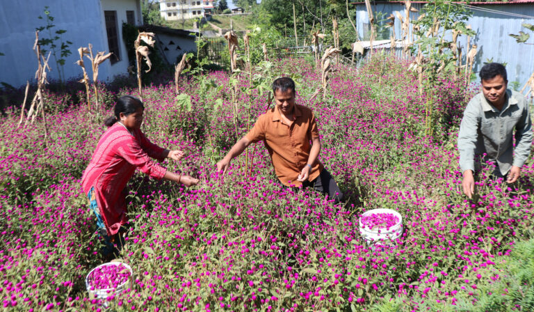 काठमाडौं– भक्तपुरको सूर्यविनायक नगरपालिका–७ स्थित गुण्डुका किसानहरू मखमली फूल टिप्न र माला गाँस्न व्यस्त देखिएका