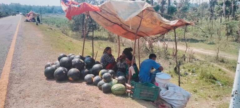 बेदकोट – महेन्द्र राजमार्ग छेउमै लहरै छन्, स–साना छाप्रा । अघिल्तिर भरिभराउ तरभुजा । किनमेल