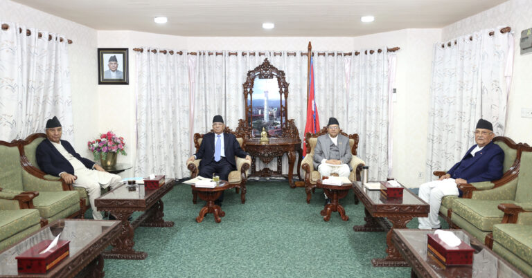 काठमाडौँ– सभामुख देवराज घिमिरे र संसद्मा प्रतिनिधित्व गर्ने तीन ठूला दलका शीर्ष नेताबीच भेटवार्ता छ