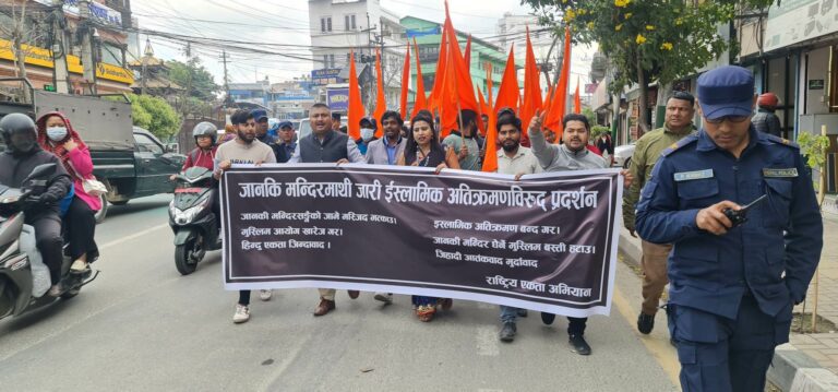 काठमाडौँ- राष्ट्रिय एकता अभियानले जानकी मन्दिरमा जारी ‘इस्लामिक अतिक्रमण’ विरुद्ध प्रदर्शन गरेको छ । आज
