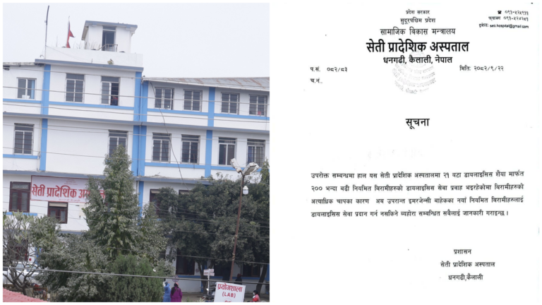 काठमाडौं– धनगढीस्थित सेती प्रादेशिक अस्पतालले डायलाइसिस सेवामा अत्यधिक चाप बढेपछि नयाँ बिरामी तथा आपत्कालीन बाहेकका