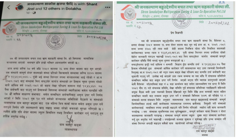 दोलखा– जिल्लाको वैतेश्वर गाउँपालिका-८ फेदीमा रहेको जनकल्याण बहुउद्देश्यीय बचत तथा ऋण सहकारी संस्थामा भएको आर्थिक