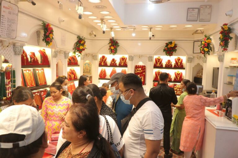 काठमाडौँ- धनतेरसका अवसरमा न्युरोडको सुन पसलमा सुनचाँदी किन्नेको भिड । यस दिन गर गहना किने