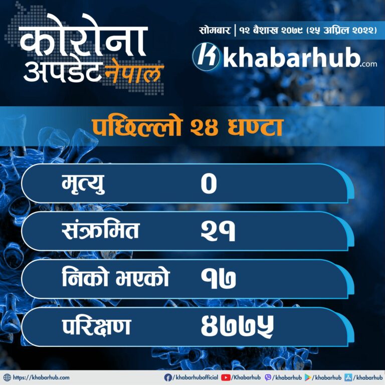 काठमाडौँ- नेपालमा पछिल्लो २४ घण्टामा थप २१ जनामा कोरोना भाइरसको संक्रमण पुष्टि भएको छ। स्वास्थ्य