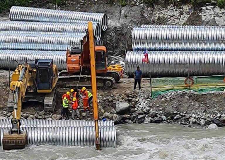 रसुवा– गत असार २४ र गत साउन १४ गते ल्हेन्देखोलामा आएको बाढीले क्षति पुगेको स्याफ्रुबेँसी-रसुवागढी खण्ड