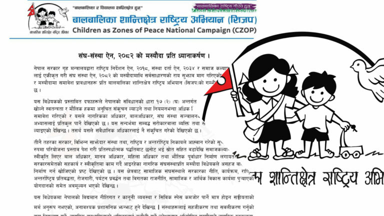 काठमाडौँ- संघसंस्था ऐन-२०८२ को मस्यौदा विधेयकप्रति बालबालिका शान्तिक्षेत्र राष्ट्रिय अभियान (सिजप)ले गम्भीर ध्यानाकर्षण भएको जनाएको