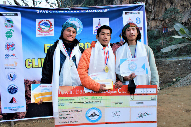 तनहुँ– जिल्लाको बन्दीपुर गाउँपालिका–४ विमलनगरको चुनपहरामा भएको रक क्लाइम्बिङ प्रतियोगिताको उपाधि दिपेन गुरुङ र पञ्चमाया