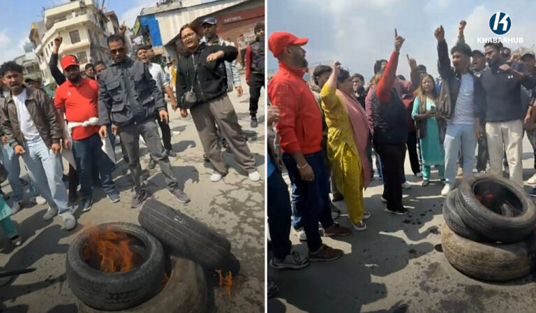 काठमाडौं– नेकपा एमाले निकट विद्यार्थी संगठन अनेरास्ववियुले भृकुटीमण्डपमा टायर बालेर प्रदर्शन गरेको छ। नेकपा एमालेका
