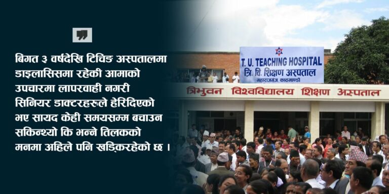 लामो समयदेखि मिर्गौला पीडित आमाको डाइलासिस गराइरहेका तिलक विश्वकर्माले गत साउनमा आमा गुमाए । रत्नराज्य