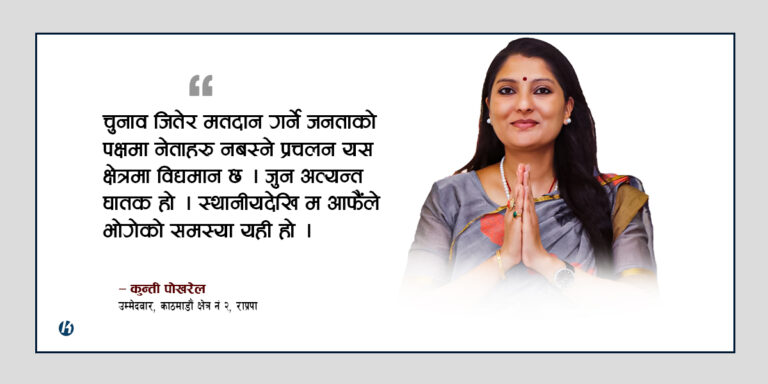 काठमाडौं– राष्ट्रिय प्रजातन्त्र पार्टी (राप्रपा) की केन्द्रीय सदस्य कुन्ती पोखरेलले यसपटकको जित सुनिश्चित भएको दाबी गरेकी