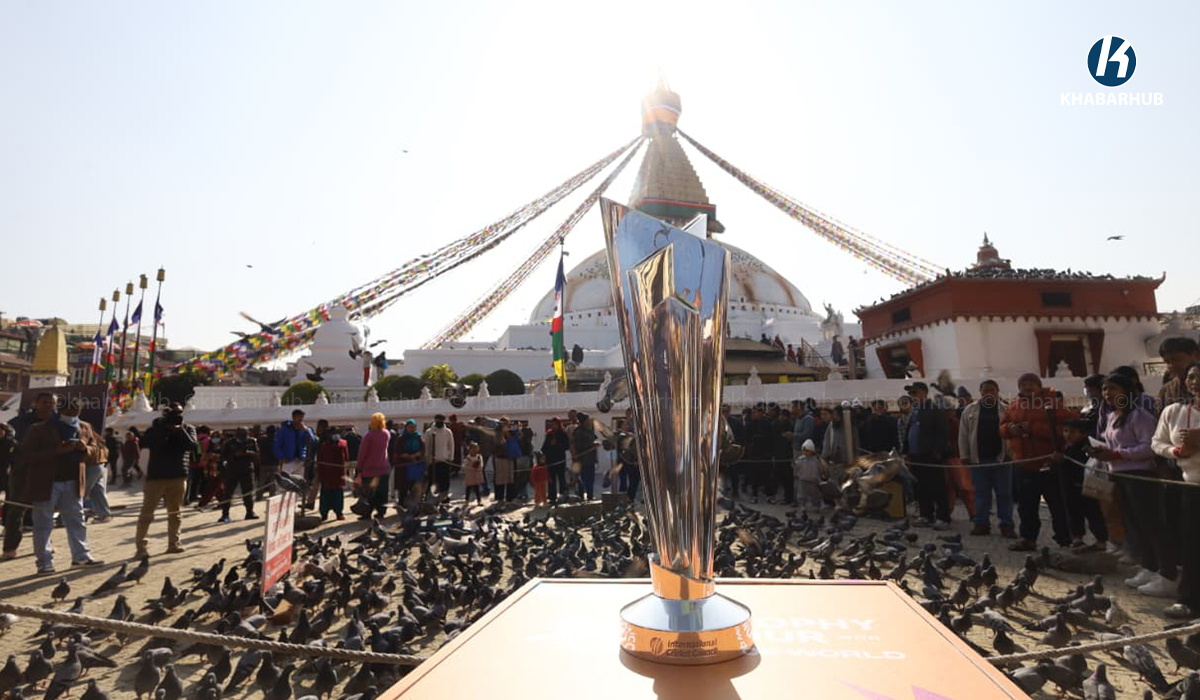 काठमाडौं- आईसीसी टी-२० विश्वकप क्रिकेटको ट्रफी बौद्धमा प्रदर्शन गरिएको छ । बौद्धमा प्रदर्शनीमा राखिएको ट्रफीसँग फोटो खिच्नको लागि मानिसहरूको भीड लागेको थियो । भारत र श्रीलंकामा हुने टी-२० विश्वकप क्रिकेटको ट्रफी सोमबारदेखि नेपालका विभिन्न स्थानमा प्रदर्शन गरिएको छ । तस्बिरहरू : नेपाल फोटो लाइब्रेरी