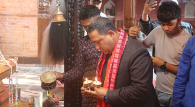 काठमाडौं– परराष्ट्रमन्त्री शिशिर खनालले मनमैजु मन्दिरको दर्शन तथा पूजाअर्चना