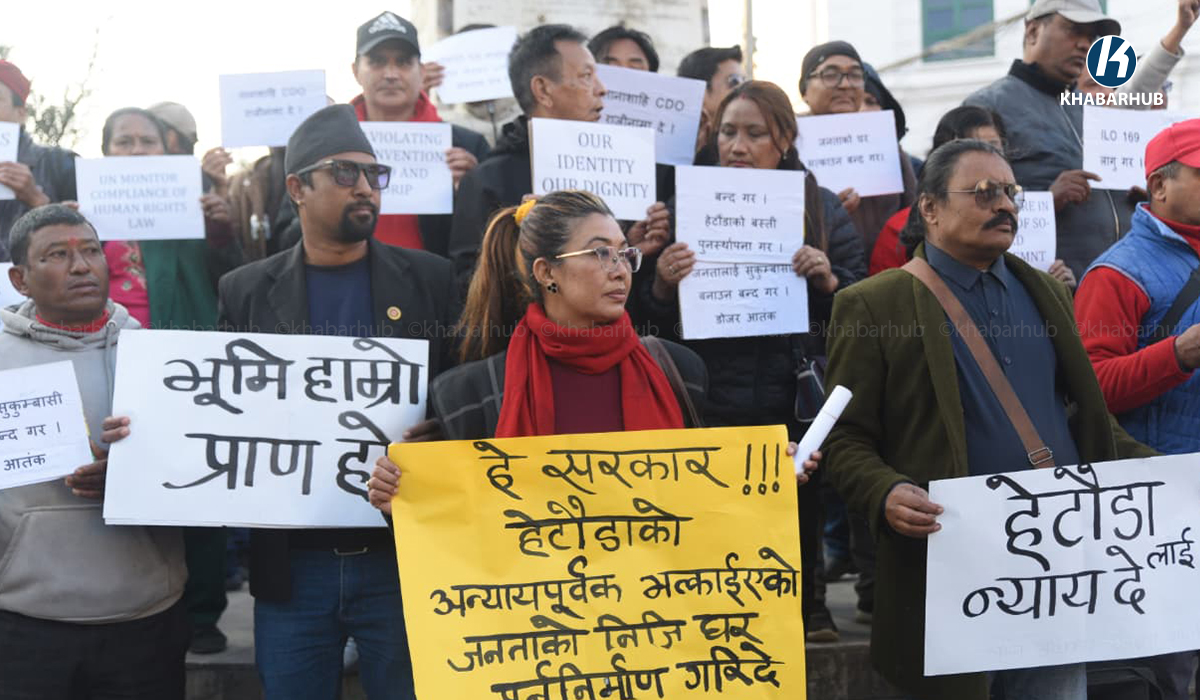 काठमाडौं- भूमि अधिकार संरक्षण समितिले 'जनतालाई उठिबास गर्न बन्द गर' भन्ने नारासहित काठमाडौंमा प्रदर्शन गरेको छ । सर्वोच्च अदालतको आदेश अवहेलना गर्दै हेटौडामा भइरहेको सडक विस्तारविरुद्ध प्लेकार्ड प्रदर्शन गरेको हो । तस्बिरहरू : नेपाल फोटो लाइब्रेरी