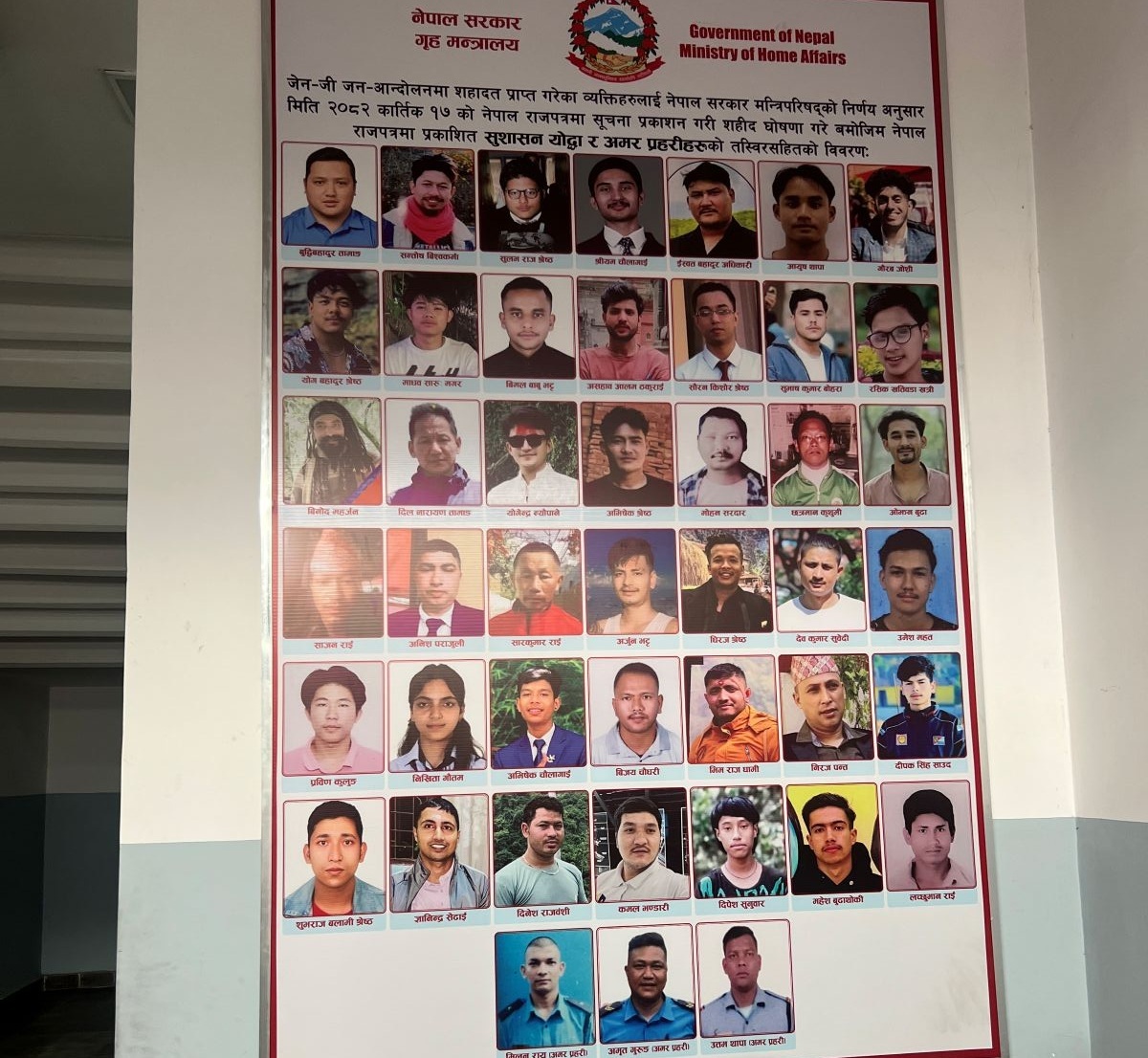काठमाडौँ– गृह मन्त्रालय प्रवेश गर्दै गर्दा सिँढी नजिकैको भित्तामा ‘फ्लेक्स ब्यानर’मा केही तस्बिरहरू झुन्डिएका छन् । ढोकाबाट भित्र पस्ने जो–कोहीको नजर सिधै तिनै भित्तामा ठोकिन्छन् । ती तस्बिरमा ४५ अनुहारहरू छन् । निर्जीव तस्बिर भए पनि तिनका आँखामा हेर्दा अधुरा सपना र परिवर्तनको आह्वान गरिरहेको…