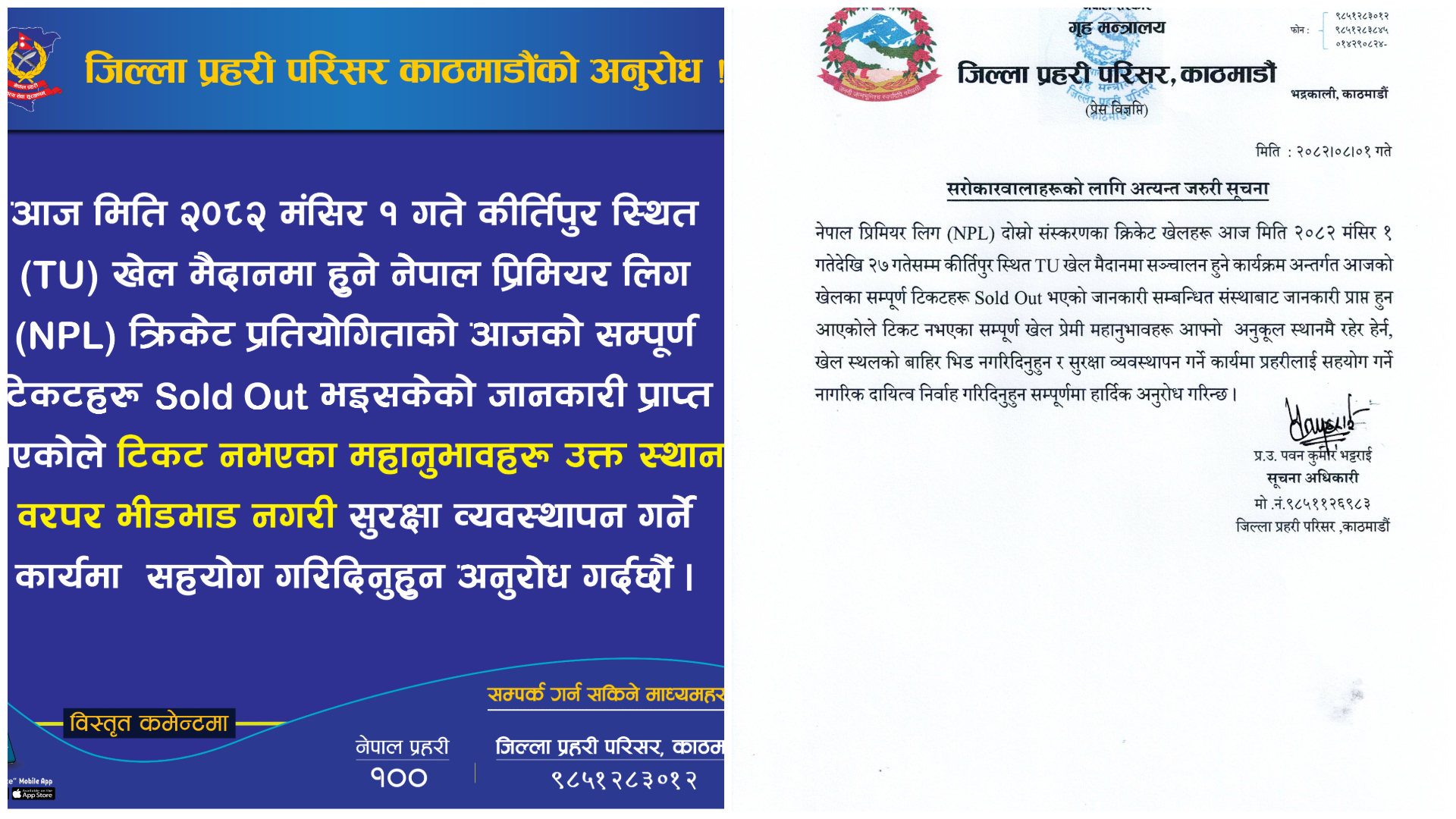 क्रिकेट खेलमैदान आसपास क्षेत्रमा भिडभाड नगर्न प्रहरीको आग्रह