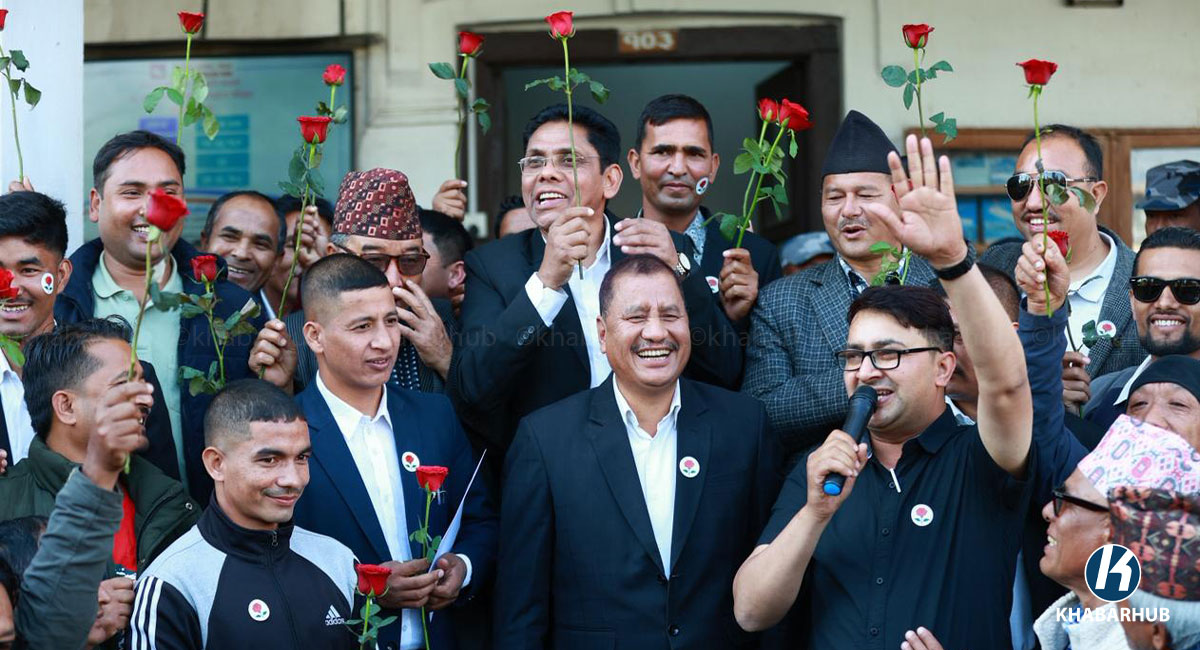 गुलाफको फूलसहित निर्वाचनमा आयोगमा विप्लवको बाजागाजा र र्‍याली