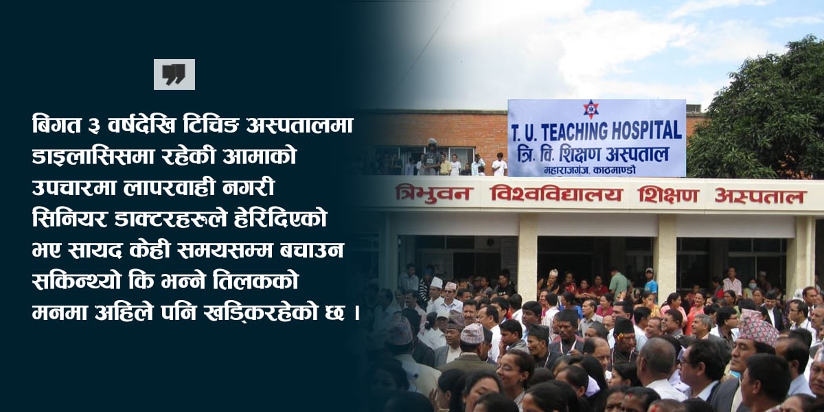 लामो समयदेखि मिर्गौला पीडित आमाको डाइलासिस गराइरहेका तिलक विश्वकर्माले गत साउनमा आमा गुमाए । रत्नराज्य क्याम्पस (आरआर कलेज)का लेक्चर समेत रहेका तिलककी ७६ वर्षीया आमा मिर्गौलासँगै फोक्सोको पनि बिरामी थिइन् ।  विगत ३ वर्षदेखि टिचिङ[ ... ]