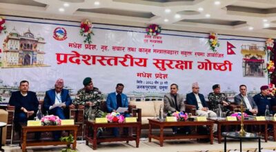 जनकपुरधाम– मधेश प्रदेश, गृह मन्त्रालय र सञ्चार तथा कानुन मन्त्रालयद्वारा संयुक्त रुपमा आयोजित एक दिने प्रदेशस्तरीय सुरक्षा गोष्ठी धनुषाको जनकपुरधाममा सुरु भएको छ। गृहमन्त्री ओमप्रकाश अर्यालबाट गोष्ठीको शुभारम्भ गरिएको हो । आजको गोष्ठीमा प्रदेशका ८ वटै जिल्लाका जिल्ला सुरक्षा समितिका पदाधिकारीहरूबाट जिल्लागत सुरक्षा अवस्था र…